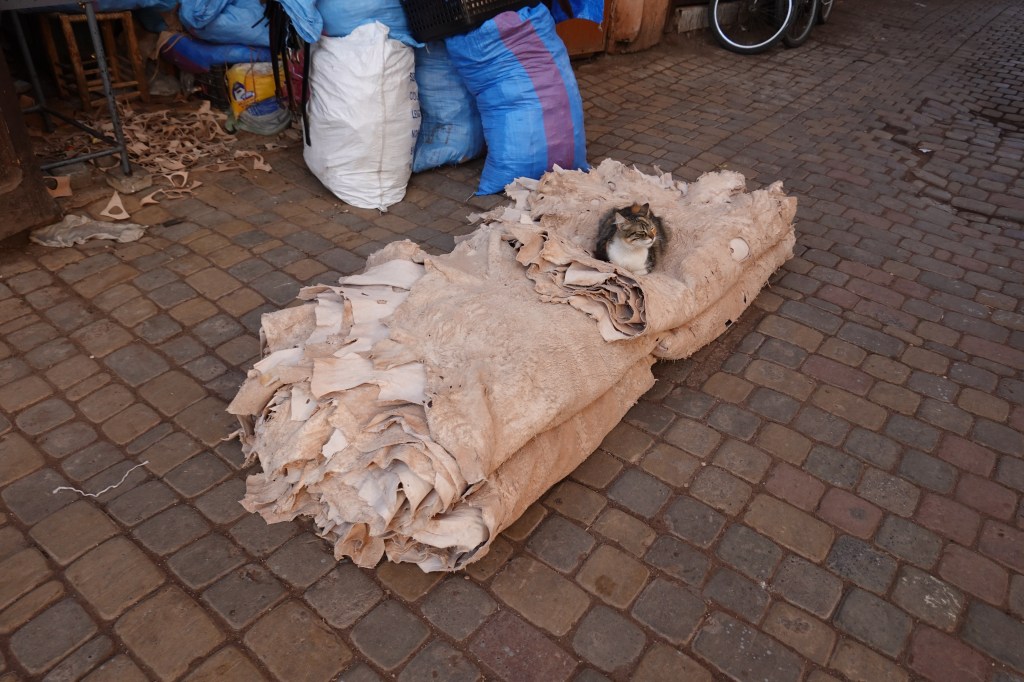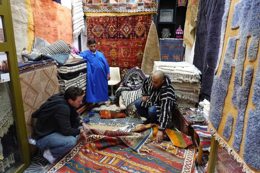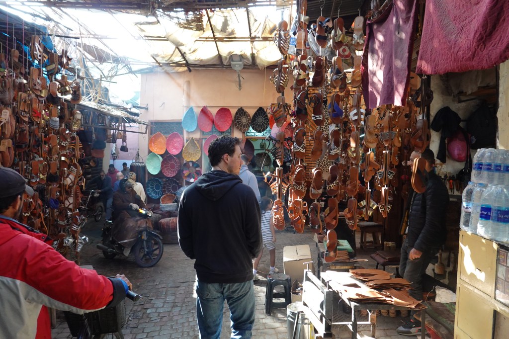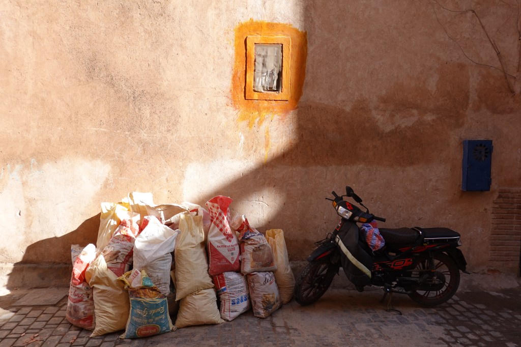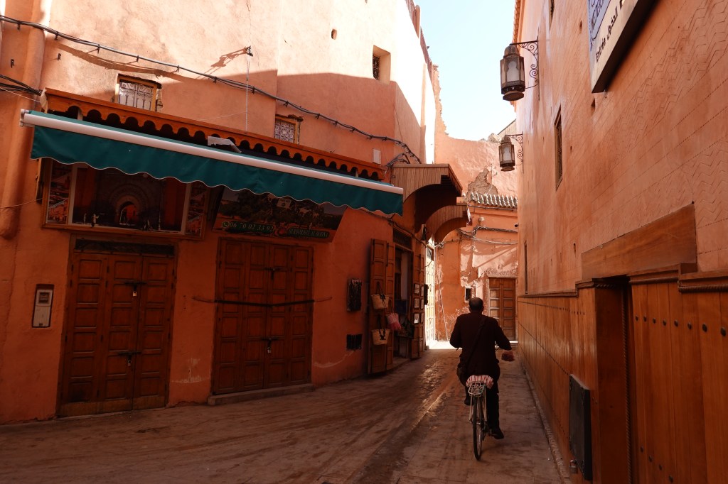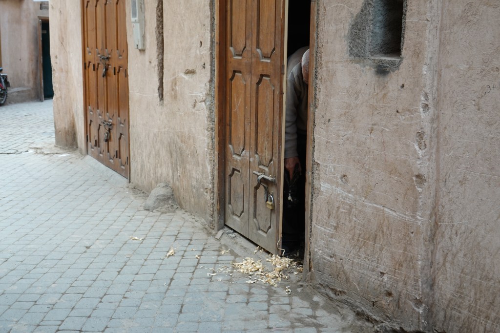Approaching the window of my taxi, a man on a motorcycle, riding fast. Stood in front of him, his young daughter, her hands gripping the inner handlebars. Both, helmet-less, smiling from ear to ear. I watched these scenes pass me by. Red, mud-brick homes; pack mules carrying bananas and dates and plastic water bottles; Chinese Docker bikes weaving through traffic like darting serpents. One week later, these sights would be unremarkable, commonplace. For the moment everything was new. I met Ben at our hotel, a tastefully decorated riad with a lush inner courtyard, whitewashed walls and a rooftop terrace. He was jet lagged but energetic and we took a cup of Morocco’s emblematic mint tea before slipping into the swarming labyrinth of the Marrakech Medina.