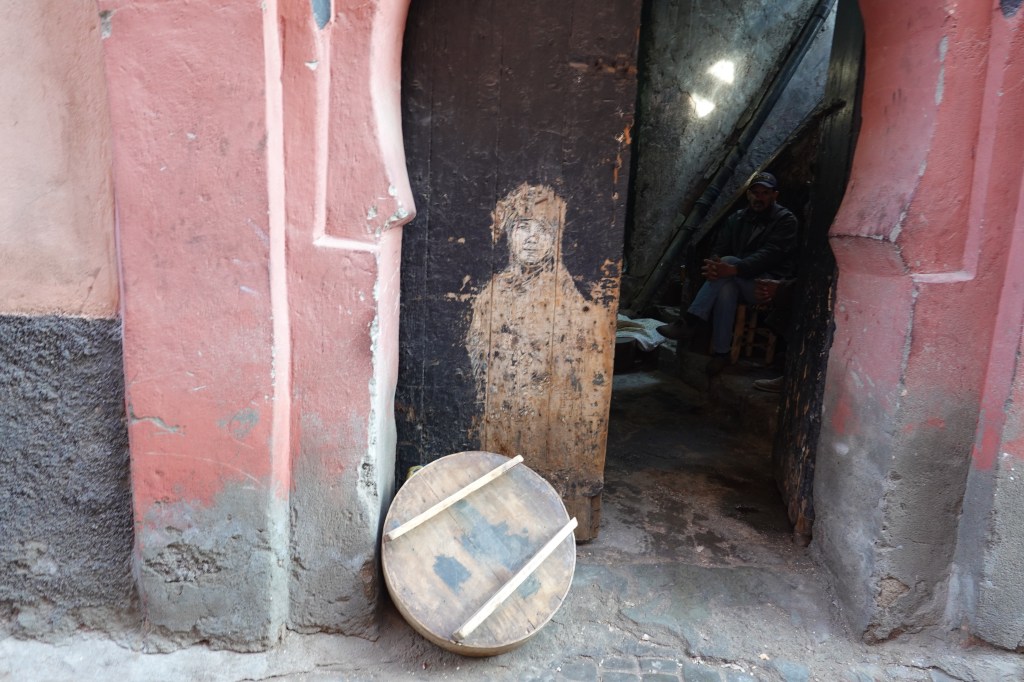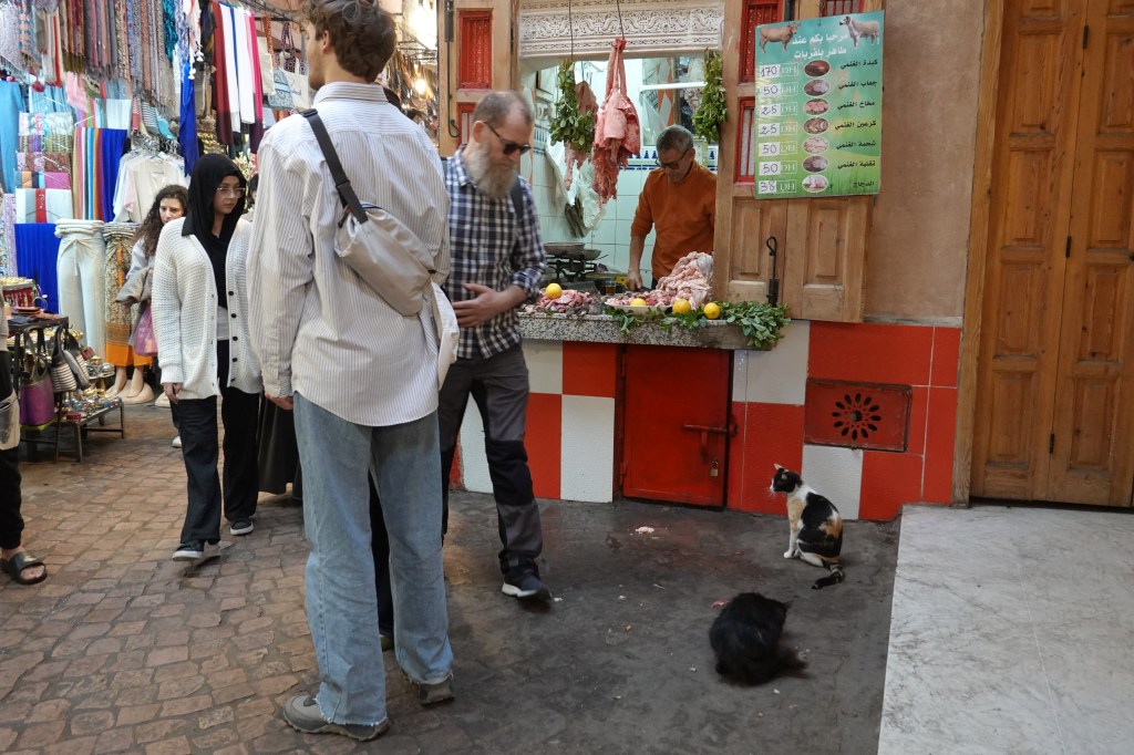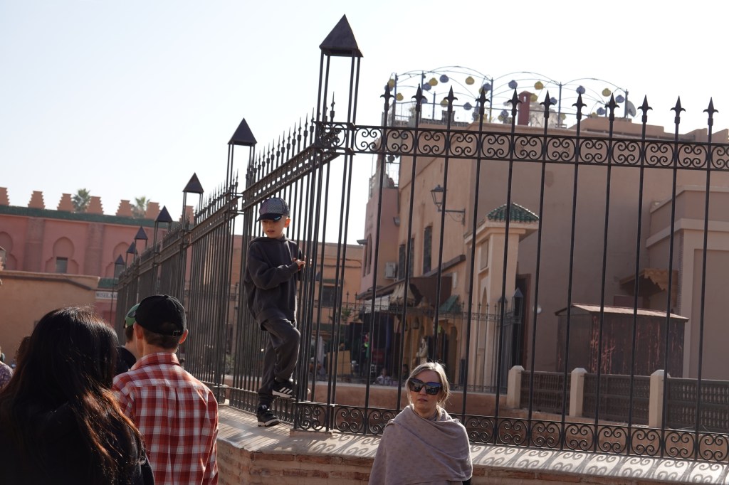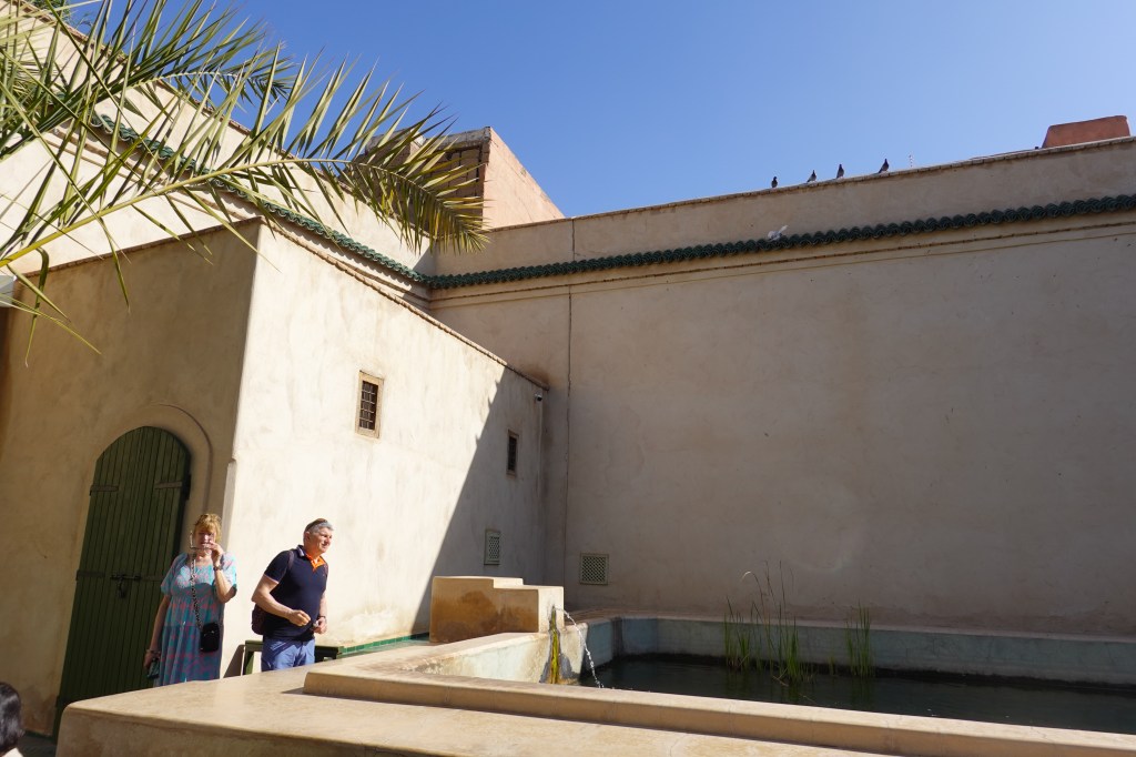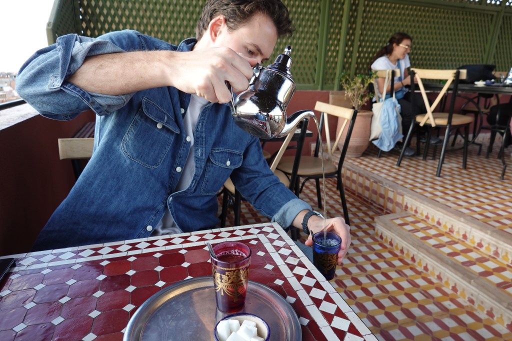 We spent our first full day by wandering, starting with a visit to the Madrasa Ben Youssef, a puzzling complex lined with small students’ quarters, and at its core a dazzling water feature. From the Madrasa we dipped into the Jardin Secret. The Jardin is a large walled oasis and boasts exotic species of plants from Marrakech-adjacent climates. Ben occupied himself by studying the space’s water circulation system and the centuries-old plumbing that moves water throughout the garden. When he was finished with his nerd-shit, we kept on with our favorite pastime: aimless walking, interrupted by the occasional bite. We visited a temporary exhibit in the Maison de la Photographie, about the development of black-and-white film photography practices in Marrakech, paralleled by the growth of the city itself. We gazed from the rooftop at the High Atlas Mountains, drinking mint tea. The sun illuminated the side of a spine-like ridge to the south. We kept walking and in the evening we got thirsty.