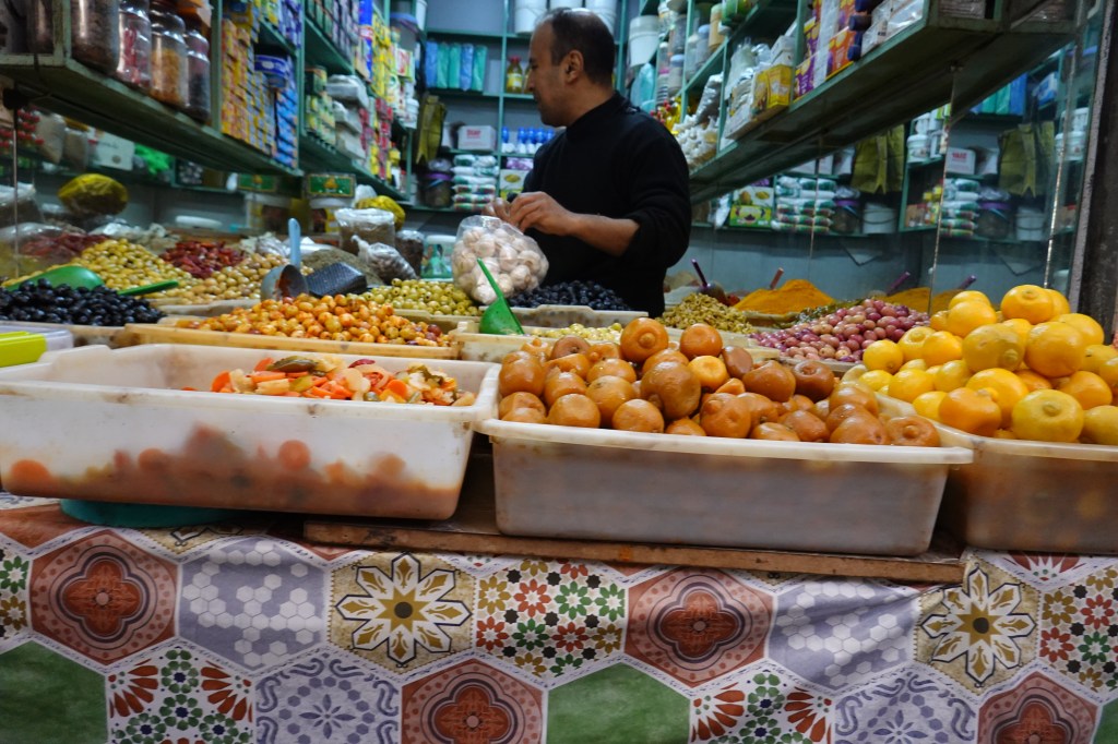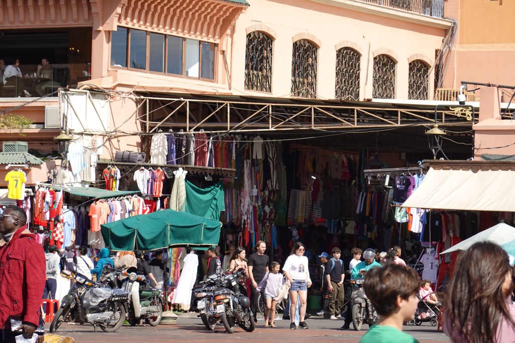 At the core of Jemaa El Fna is a grid of restaurant stalls, each equipped with a team of advertisers, tasked with wrangling tourists toward their stall. These men have memorized their universally-underwhelming sales pitches, each parroting the same words as the next. “Don’t panic, it’s organic!” touts one, followed by a parade of “Best quality!” and “For you, best price! Moroccan price!” We fended off the salesmen as best we could, though they would physically insert themselves in our path or grab onto us with their hands, as though we were thrown into a pond of leeches. Finally we stopped at a stall, where we heard the salesman saying “Honestly, it is all the same thing. We all just want business, and it is all good.” The food was good – kebabs of chicken and vegetables and lamb, and a decent harira soup (a tomato-based soup with chickpeas and other legumes, served before most meals) – and as we walked away, through the parade of salesmen, we heard iterations of the same spiel that had won our business.