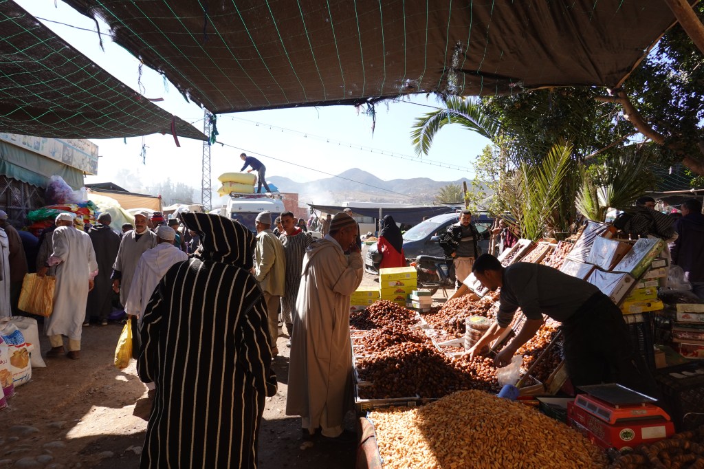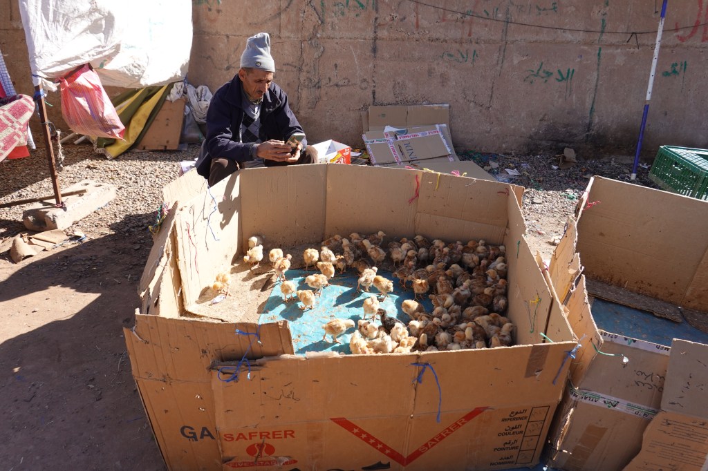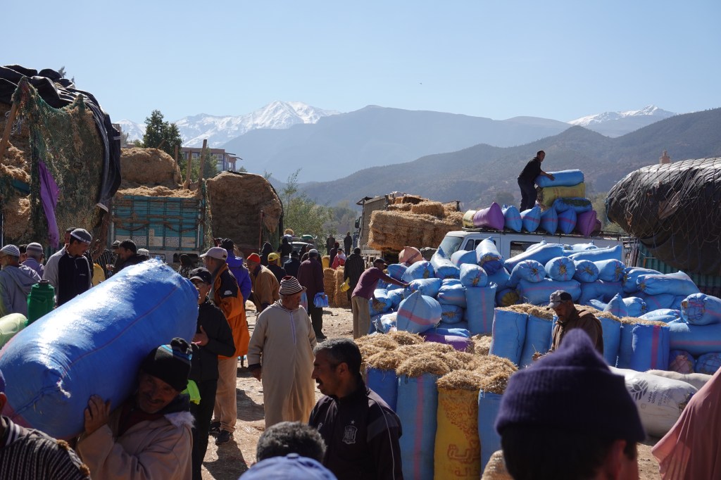 Ourika, at the foot of the Atlas Mountians, is a gateway between Marrakech and the High Atlas Amazigh communities. Every Monday morning, a large outdoor market takes place. Thousands of people come to Ourika to buy, sell, and trade goods. If it exists, you can likely find it at the Berber market – razors, washing machines, cellphones, textiles, motorcycles, hay, rabbits, beef. The labyrinth of market stands is constantly moving, shifting. Some vendors do not own stands, and instead sit in chairs by the road. Vendors are resourceful: a Coca-Cola bottle is used to hold peanut butter, or gasoline. A used pizza box doubles as a sunhat. Peeling my eyes from the fruit stands, I see a man holding a chicken upside down, a sheep auction, a child driving a Chinese motorcycle. Sheep heads, upside-down, on the floor of the slaughterhouse.